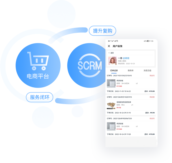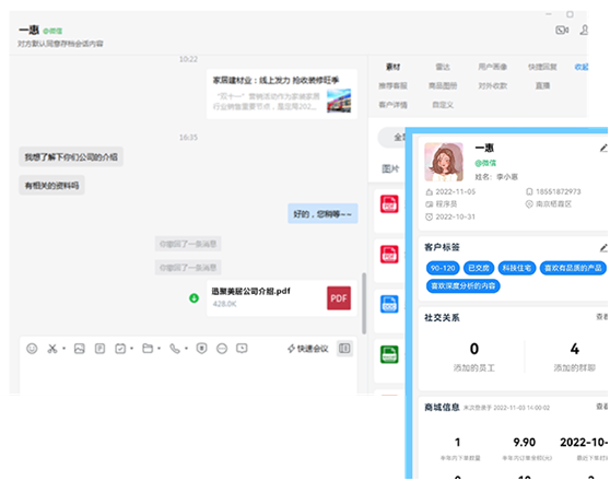 打通商城小程序平台,助力商家打造智慧新零售。可支持订单绑定客户,绑定后,方便员工在与客户聊天侧边栏中查看到该客户的历史订单记录,购物车记录以及浏览足迹,还可一键发送商城优惠券,帮助商家形成服务闭环,提升复购