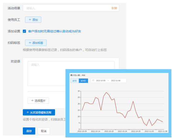 ● 支持员工活码,可以为每个二维码设置不同的标签规则,客户添加后,自动给客户打上该标签;个性化推送,一人一语;统计扫码数据,帮助企业分析渠道质量,了解客户来源